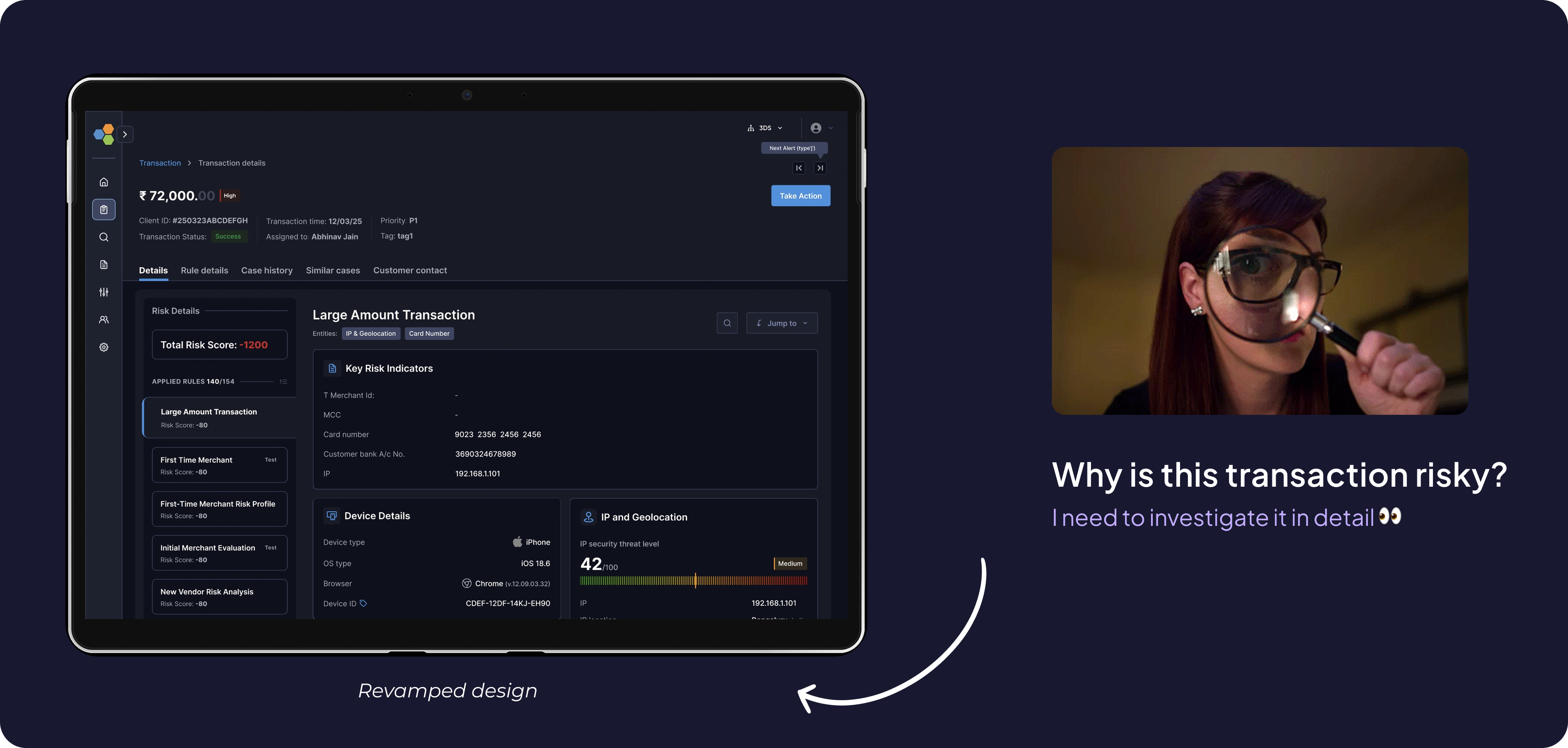 “Meet Rajeshwari, a risk analyst at **** bank, At 10:20 A.M opens Case #204592: a high‑value, cross-border wire transfer flagged by 8 rules due to a card txn. happened from a different IP. She has 120 open cases, a backlog rising by 18%, and just 10 minutes per case.