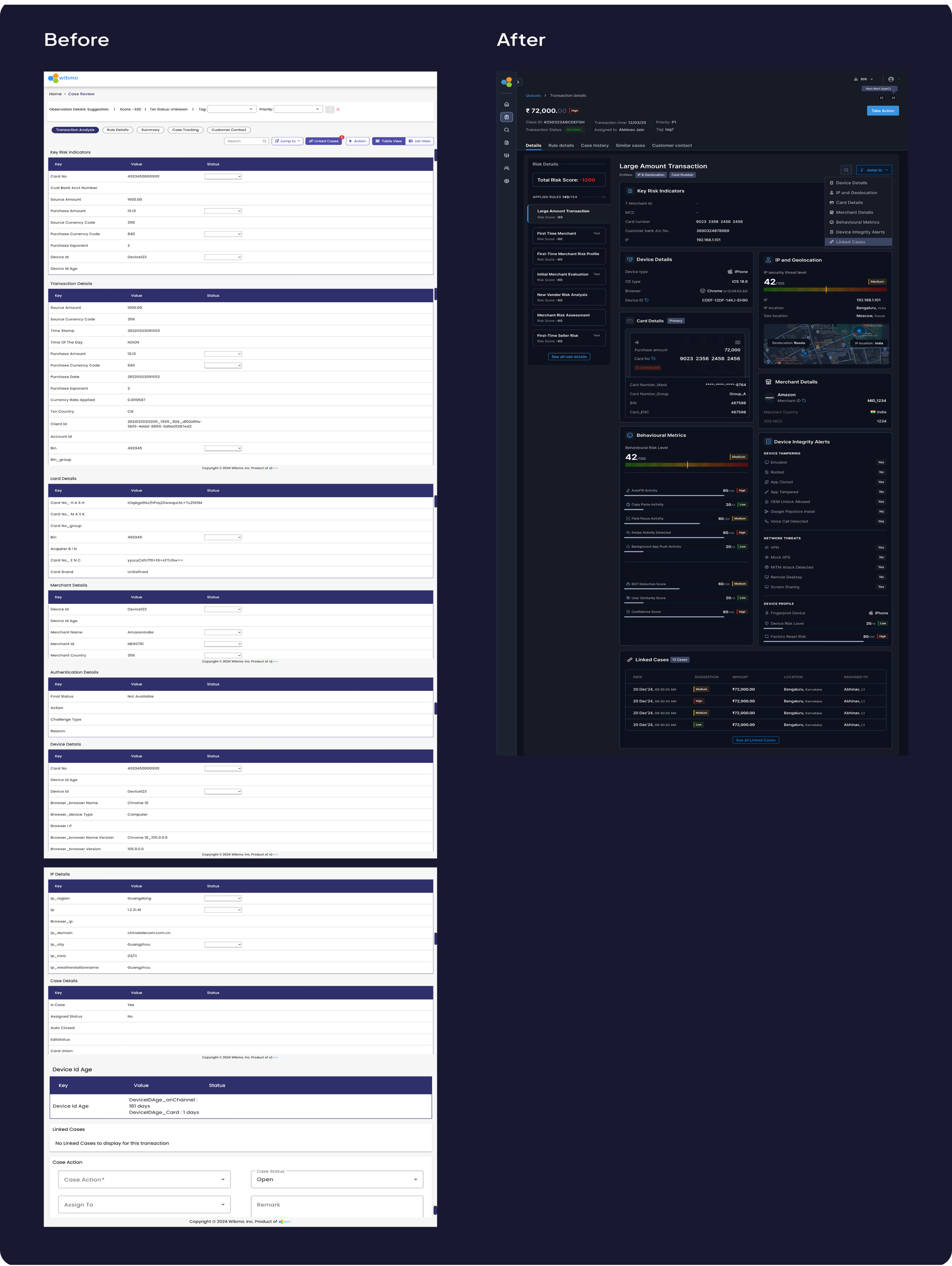 Entity relationships (linked cards, IPs, devices) existed but not surfaced, 4-5 tabs opened simultaneously to cross-reference