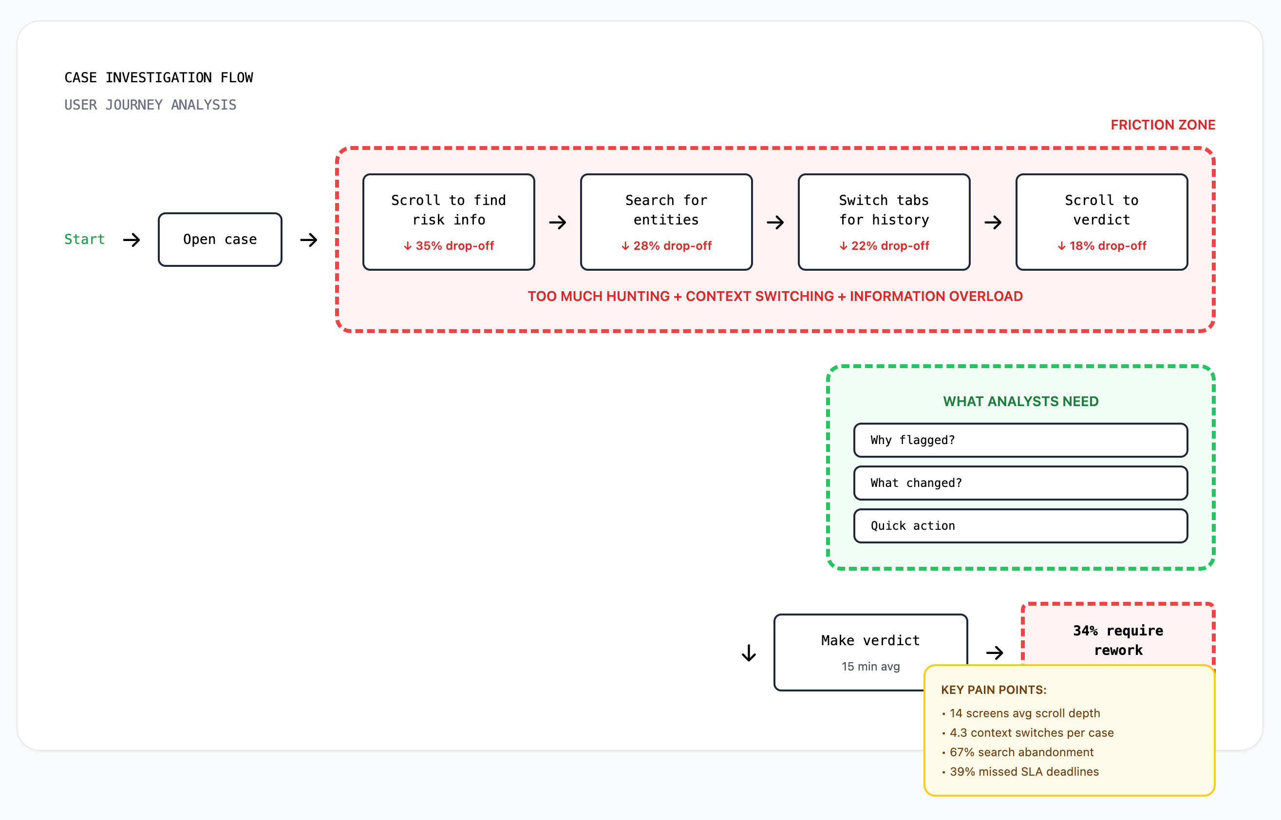 Analysts needed 'why flagged?' first, but buried 8-12 scrolls deep, 83% used Cmd+F to search instead of scanning